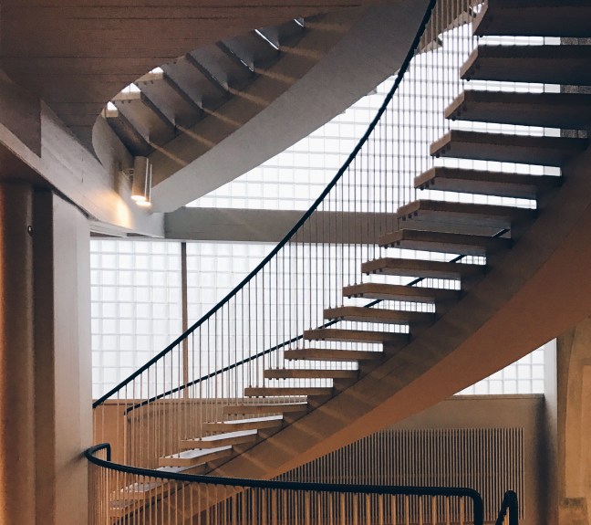 Ervi on leikitellyt portaikolla myös Töölössä. Siinä missä Porthanian portaikko muodostaa lehtiaiheen, on Töölön kirjastossa oikea arkkitehtuurijekku: kolmikerroksinen kierreportaikko päättyy pyöreään kattoikkunaan. Silmähän se siellä, kirjastoon ja lukemiseen hienosti sopien. Kuka vielä väittää, ettei modernismissakin voisi olla lystikkyyttä ja yksityiskohtia?